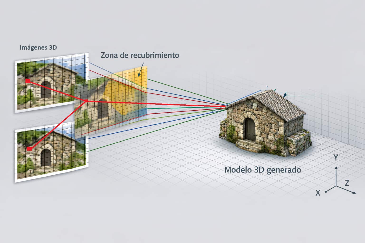 El funcionamiento de la fotogrametría se basa en que, si disponemos de dos imágenes de un mismo objeto tomadas en diferentes posiciones, pero con recubrimiento (zona en común) de una parte del objeto, podremos intersecar rayos convergentes en puntos homólogos y, por cada par de píxeles (2D) de las imágenes, obtener un punto 3D en el espacio o modelo.